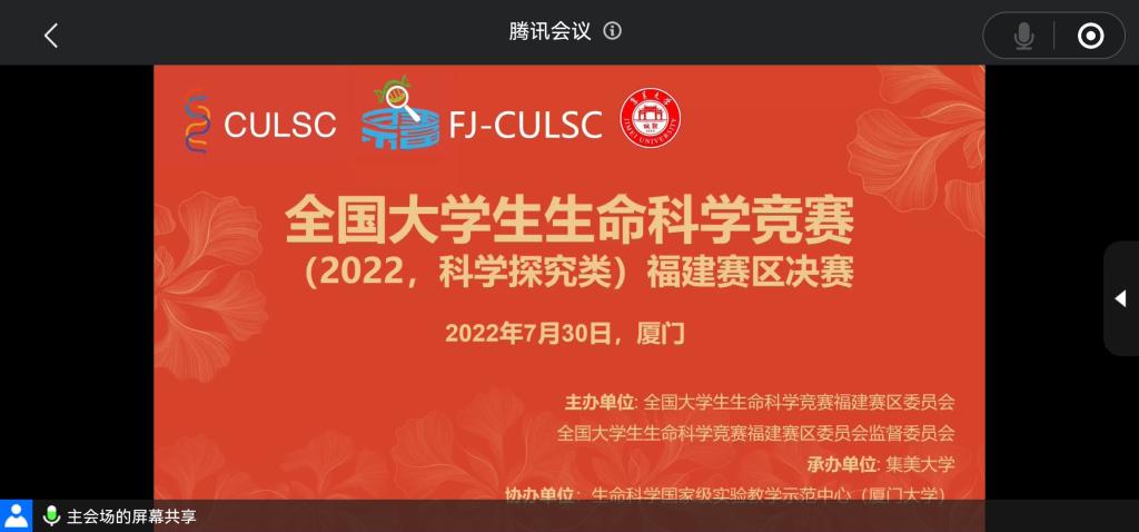 2022年7月30日,由全国大学生生命科学竞赛福建赛区委员会主办、集美大学承办、厦门大学生命科学国家级实验教学示范中心协办的全国大学生生命科学竞赛(2022,科学探究类)福建赛区决赛在厦门集美大学拉开帷幕,我院共有18支队伍参加此次竞赛,其中6支队伍成功进入省赛。经过紧张激烈的专家审评和线上答辩,我院学子在本次全国大学生生命科学竞赛中喜获国家三等奖一项,省赛二等奖一项,省赛三等奖五项。