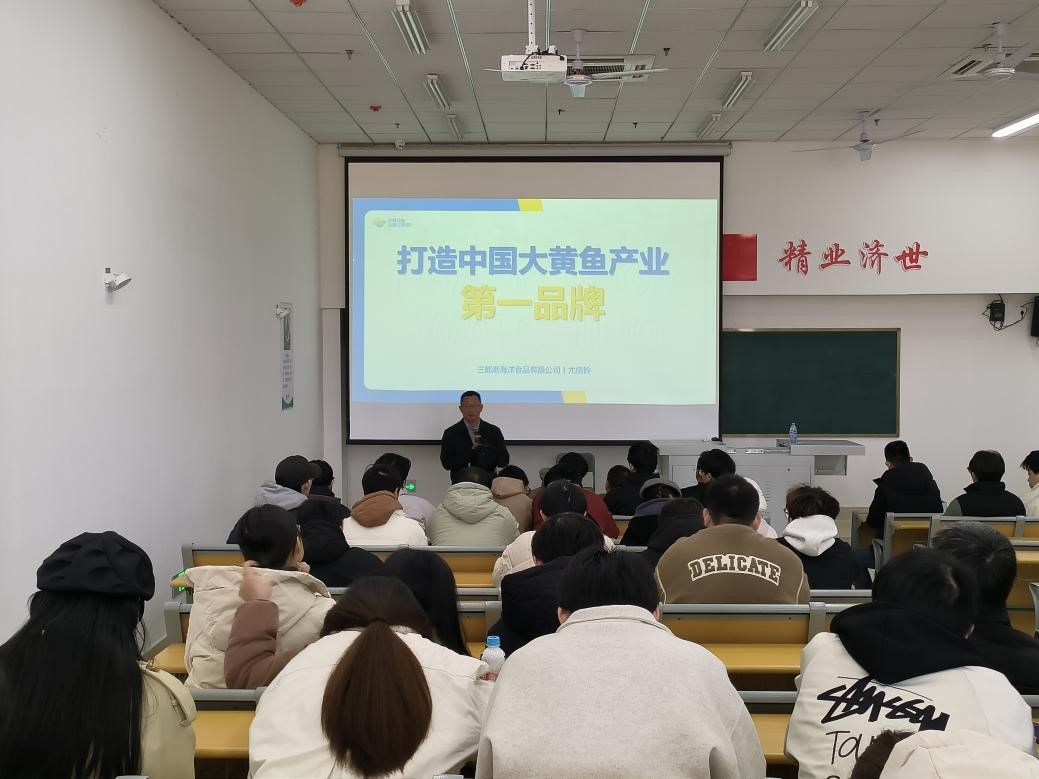 1月8日上午,我院邀请三都港海洋食品有限公司总经理尤信铃在医教楼101开展“大黄鱼品牌建设——三产融合发展之路”专题讲座,我院党委班子、师生代表和生物科学与工程学院学生代表参与讲座。讲座由副院长孙壮桥主持。