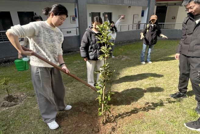 此外,在3月12日下午,我院团委还与实践部共同举办线下植树活动。同学们在求实楼周围草地集合,手持树苗和植树工具,热情高涨。实践部为同学们提供了桔子树苗和桂花树苗,并设置了心愿寄语小木牌环节。同学们四人一组,有的手持铁锹挖坑,有的搬运树苗,有的挥锹培土,有的负责浇水。大家齐心协力,有条不紊。经过一番努力,一棵棵树苗在草地上挺立起来,为校园增添了一抹新绿。最后,同学们纷纷在小木牌上留下自己的心愿寄语,挂在树苗上,以实际行动践行绿色环保理念。