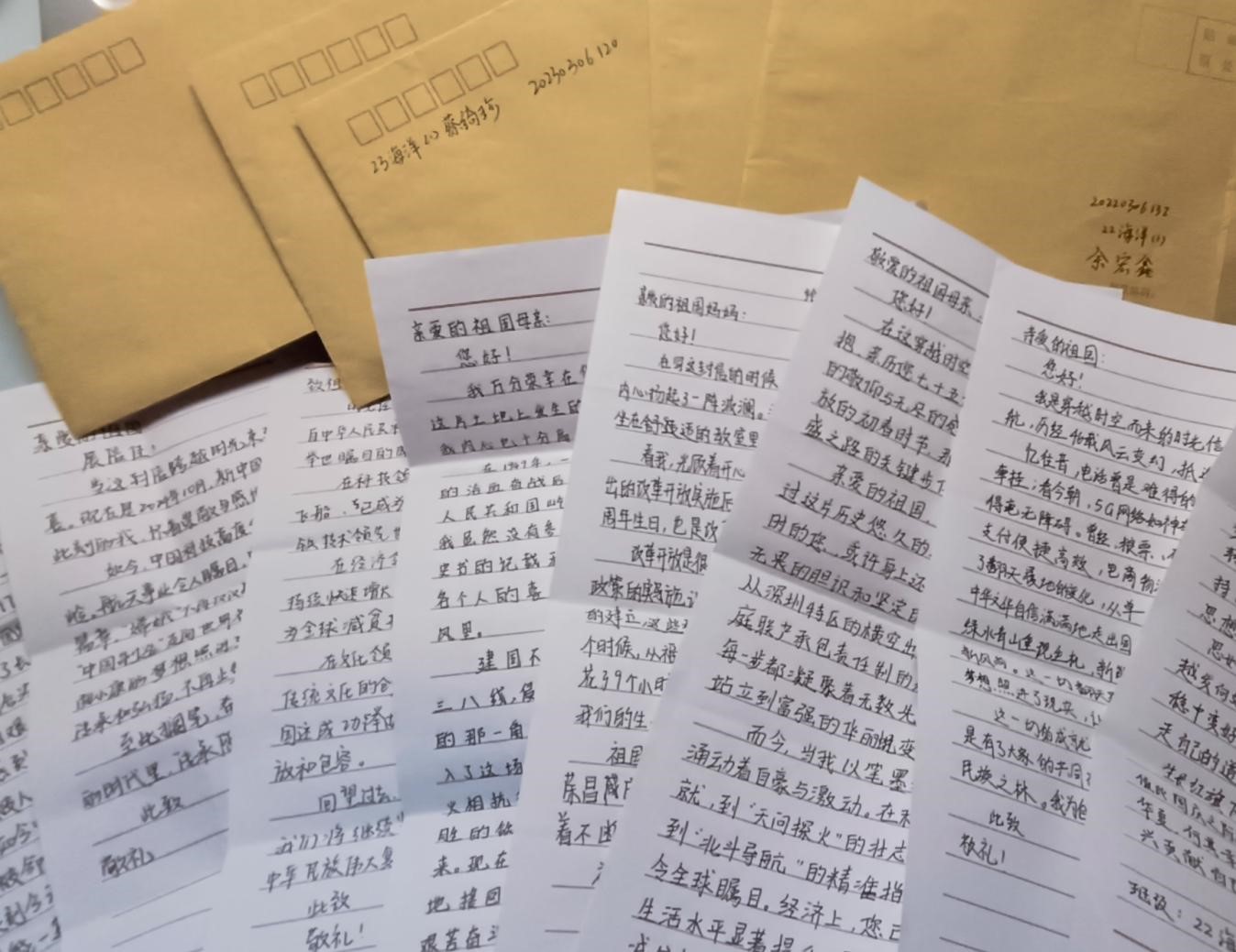 在“时光邮差——致祖国的一封信”活动期间,我院45名学生用一纸信笺,蝶使蜂媒,现场书写心中对祖国的祝福与关怀。同学们以书信的形式与为国家发展牺牲的先烈们对话,向那个时代的人们描绘今朝的国泰民安。一封封饱含深情的信件,不仅表达了对先辈的敬意,更寄托了对祖国美好未来的期望和祝福。