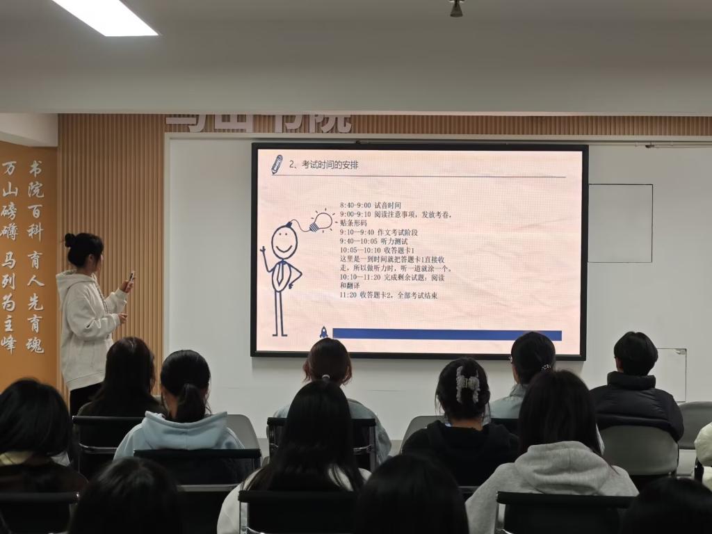 在本次分享会中,主讲人们围绕答题分数占比、答题技巧、写作、个人学习经历等方面向学生们讲述了如何为四六级考试作准备的方法,并探讨了如何在考试中运用技巧以达到最佳表现。不同主讲人在备考策略上各有见解,他们都一致强调了写作和听力部分在提升考试成绩中的关键作用。同时,主讲人们也向学生们阐述学习英语的重要性,提供学好英语的方法,并给予学生们重要学习建议和厚望。