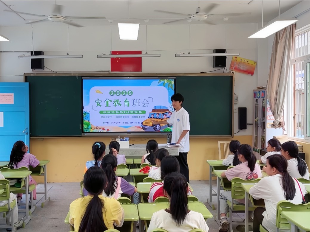 飞鸾中心小学校长林朱明在致辞中对周建辉书记带队支教表示诚挚感谢,他提到,高校支教团队的到来为乡村学校注入了新鲜血液,期待双方以夏令营为起点,构建长效化的教育合作机制。随后,周建辉与林朱明共同宣布“育梦夏令营” 正式开营。仪式结束后,周建辉深入班级观摩安全教育主题班会,与队员们亲切交流,了解支教团队教学生活环境。