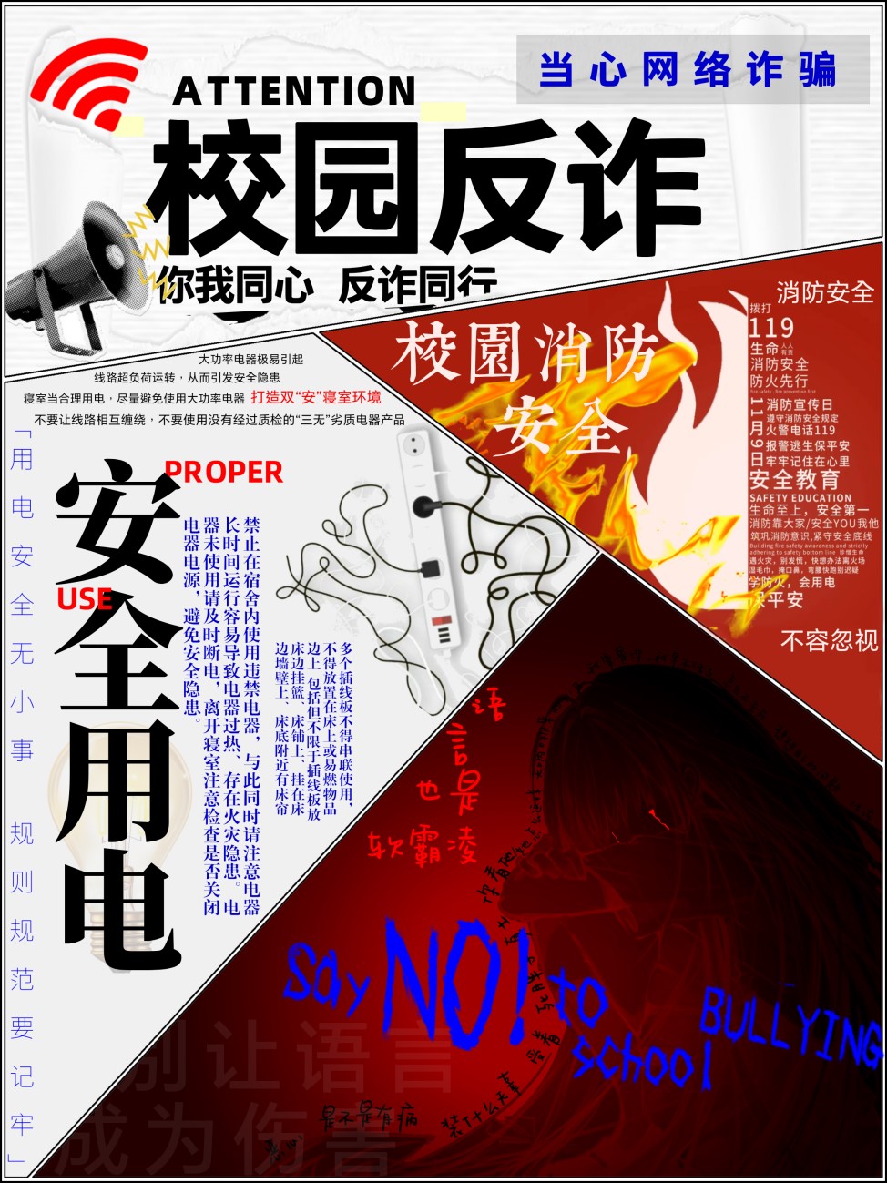 本次海报设计比赛鼓励参赛者围绕消防安全、用电安全、食品安全、防踩踏、防诈骗、交通安全等校园安全核心领域进行创作。同学们积极响应,充分调动专业知识储备,迸发创新思维火花。大家或拿起画笔,或熟练运用设计软件,将拒绝“三无”产品、警惕电信诈骗、校园内骑行规范等安全要点,巧妙且艺术地融入海报创作之中。部分作品以强烈鲜明的色彩碰撞、极具视觉冲击力的画面构图,直观展现忽视安全的严重后果;还有作品凭借温馨细腻的笔触,将实用安全知识娓娓道来。每一幅作品都饱含着同学们对安全理念的深度思考与独特理解,堪称匠心之作。
