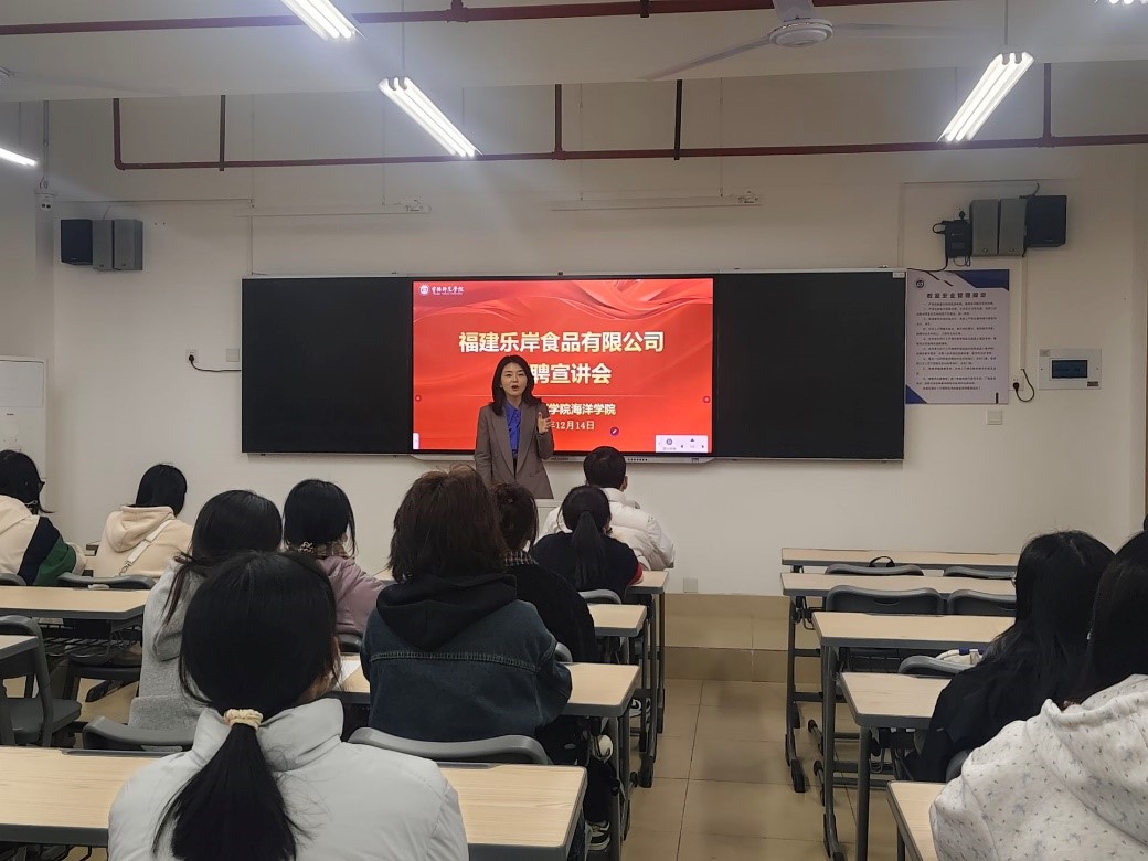 福建乐岸食品有限公司是一家集金枪鱼原料采购、产业加工、国内外贸易于一体的综合性食品企业。宣讲会上,福建乐岸食品有限公司负责人通过宣讲,全方位展示了企业文化与岗位需求,明确各岗位的职责与任职要求,并耐心回答工作方式、薪资待遇、未来发展等方面的问题,让学生对公司有了进一步了解。