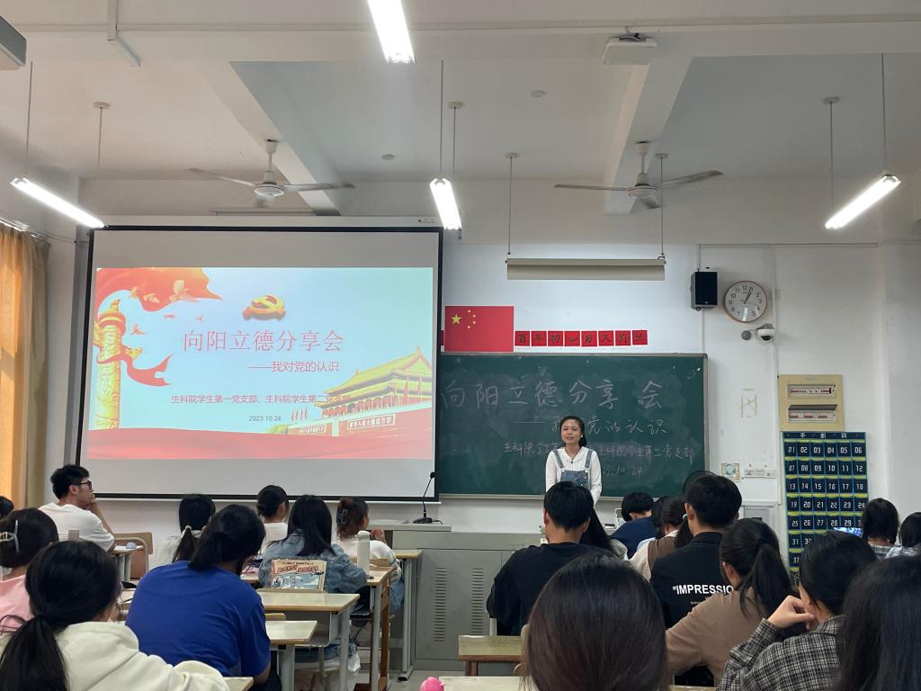 为更好引导我院入党积极分子及发展对象积极树立正确入党动机,坚定永远跟党走的决心,生命科学学院党委组织学生预备党员于2023年10月24日中午在求实楼CA201举办“我对党的认识”专题向阳立德分享会。学生党员围绕我校第6期预备党员培训班所学,结合自身发展经历及感悟,以青年党员力量,感召同学们积极响应党的号召,以斗志昂扬的姿态迎接新阶段,激发同学爱党爱国情怀。