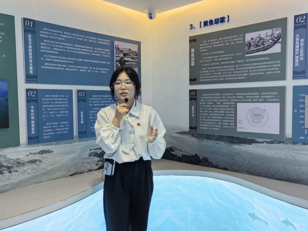 活动伊始,支部党员何丽贞同志化身讲解员,为支部全体成员讲解展示馆前的福船模型,还通过全息投影技术直观感受大黄鱼从人工繁育、深海网箱养殖到冷链物流的全产业链发展历程。在展区的第二部分,讲解员郭湉湉通过生动有趣的国鱼故事,讲解了端午节间在民间关于大黄鱼的相关习俗,加深了党员们对大黄鱼的认识。随后,讲解员张慧萍详细讲述了大黄鱼产业从上世纪60年代敲罟渔法导致资源枯竭,到刘家富团队在突破人工育苗技术的复兴历程,党员们对“绿水青山就是金山银山”这一理念有了更深入的理解。最后,大家来到大黄鱼文创展区,沉浸式欣赏了陈丹丹老师的非物质文化遗产——鱼拓、以黄鱼满仓为理念的吊顶设计、大黄鱼美食模型等,对大黄鱼文化有了更全面的认识。讲解员深入浅出的讲述,让党员们沉浸其中,对大黄鱼产业有了全方位、深层次的认识。通过参观与讲解,党员们深刻体会到“海洋强国”战略的伟大意义,更加坚定了投身海洋经济的信念与决心。