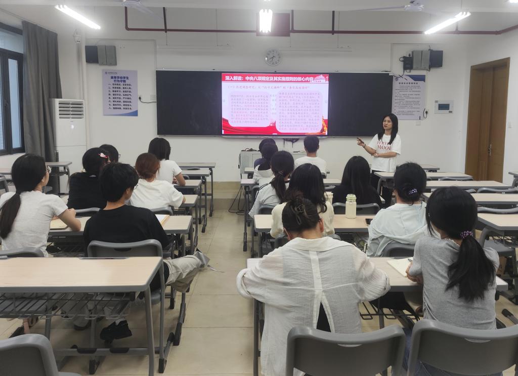 党课过程中,苏晗逐条领学了中央八项规定原文,重点解读了改进调查研究、精简会议活动、厉行勤俭节约等核心内容,强调学生党员要从小事小节守起,坚决抵制特权思想和奢靡之风。通过学习,全体党员纷纷表示要始终坚守“干净做事,清白做人”的原则,把‘干净’二字刻进心底。